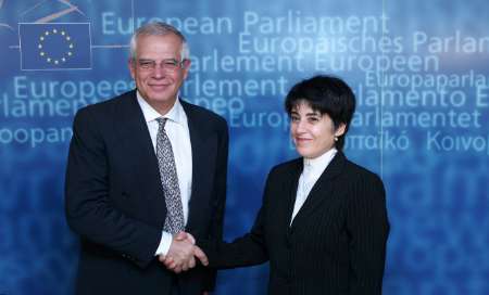 Sakharov Prize winner in 1995, Kurdish activist Leyla Zana (R) is welcomed by European Parliament President Josep Borrell at the EU Parliament in Brussels, October 13, 2004. Zana said Turkey was moving fast towards European values as she visited Brussels to collect a human rights prize on her release from jail, nine years after she was awarded it. REUTERS/Francois Lenoir