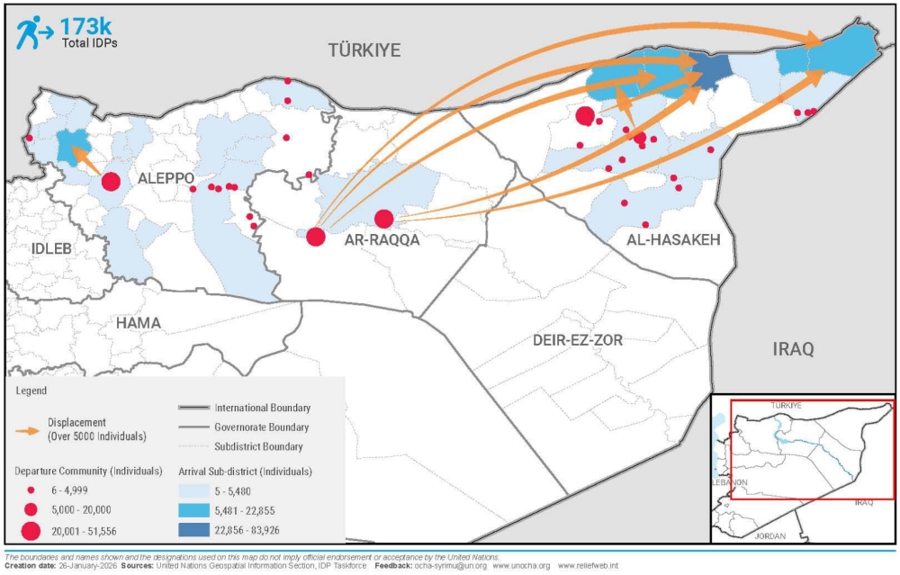 Displacement remains significant. As of 25 January, more than 170,000 internally displaced persons were recorded across 178 communities in 27 sub-districts in Aleppo, Al-Hasakeh, and Ar-Raqqa governorates. Qamishli hosts the highest number of displaced people, with approximately 97,900 IDPs, followed by Al-Malikiyyeh District with around 32,000 IDPs. Camps including Newroz, Areesha, and Sere Kaniye continue to face service gaps, overcrowding, and onward population movements, while access constraints limit verification and response efforts.