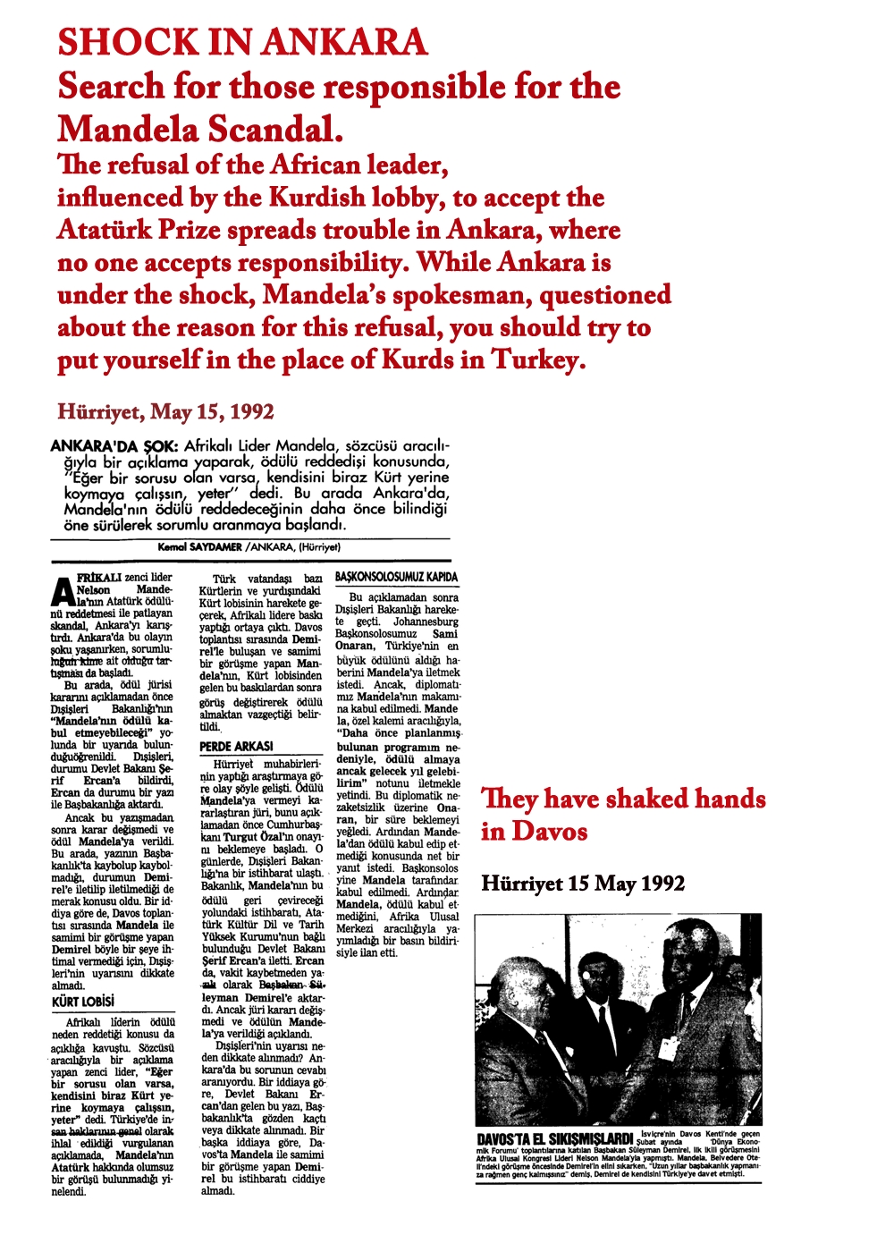 A few days later, Mandela announced, through his spokesman, that he was refusing the Ataturk Prize “because of the persecution of the Kurdish people in Turkey”.