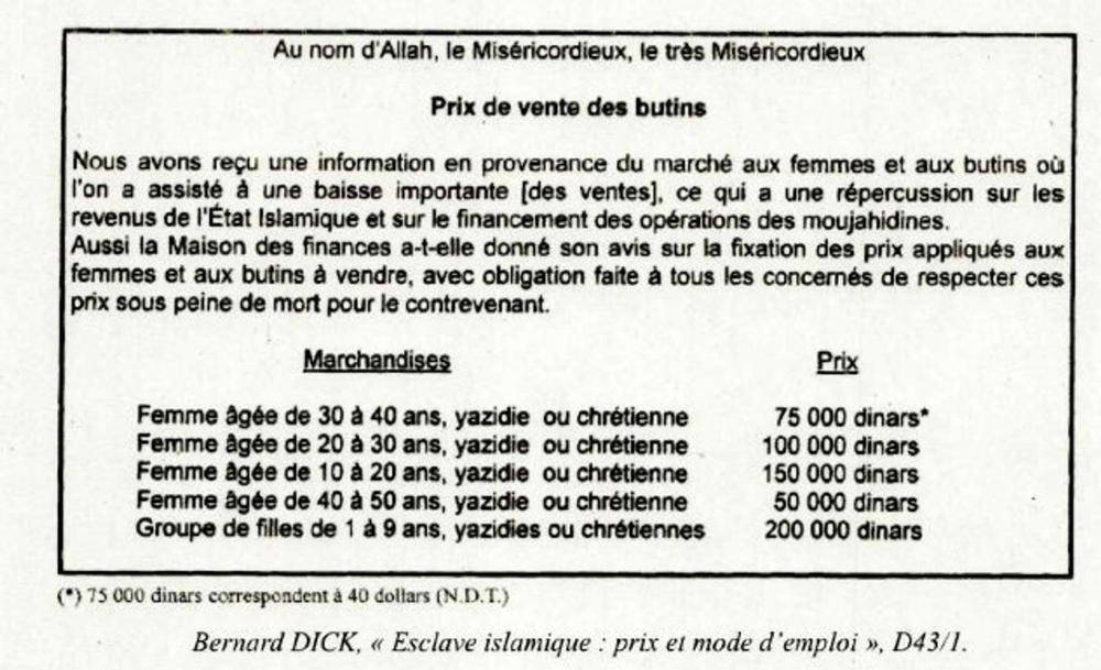 Un manuel, publié à l’automne 2014 par un comité de savants religieux de l’EI, sous forme de 32 questions-réponses, illustre à quel point l’organisation avait rationalisé ces crimes pour les rendre « religieusement acceptables », selon la formule de Bahzad Farhan. « Peut-on chevaucher la captive immédiatement dès qu’on la possède ? Si elle est vierge, l’homme peut la chevaucher immédiatement dès qu’il en est maître. Si elle n’est pas vierge, il faut auparavant s’assurer que la matrice est vide » ; « Est-il possible de chevaucher l’esclave impubère ? Il est possible de chevaucher l’esclave impubère si elle est anatomiquement valable. Si elle n’est pas valable, il peut se contenter de jouir d’elle sans la chevaucher » ; « Est-il permis de frapper son esclave ? Il est permis de frapper son esclave [sauf si cela] provoque une fracture », etc.