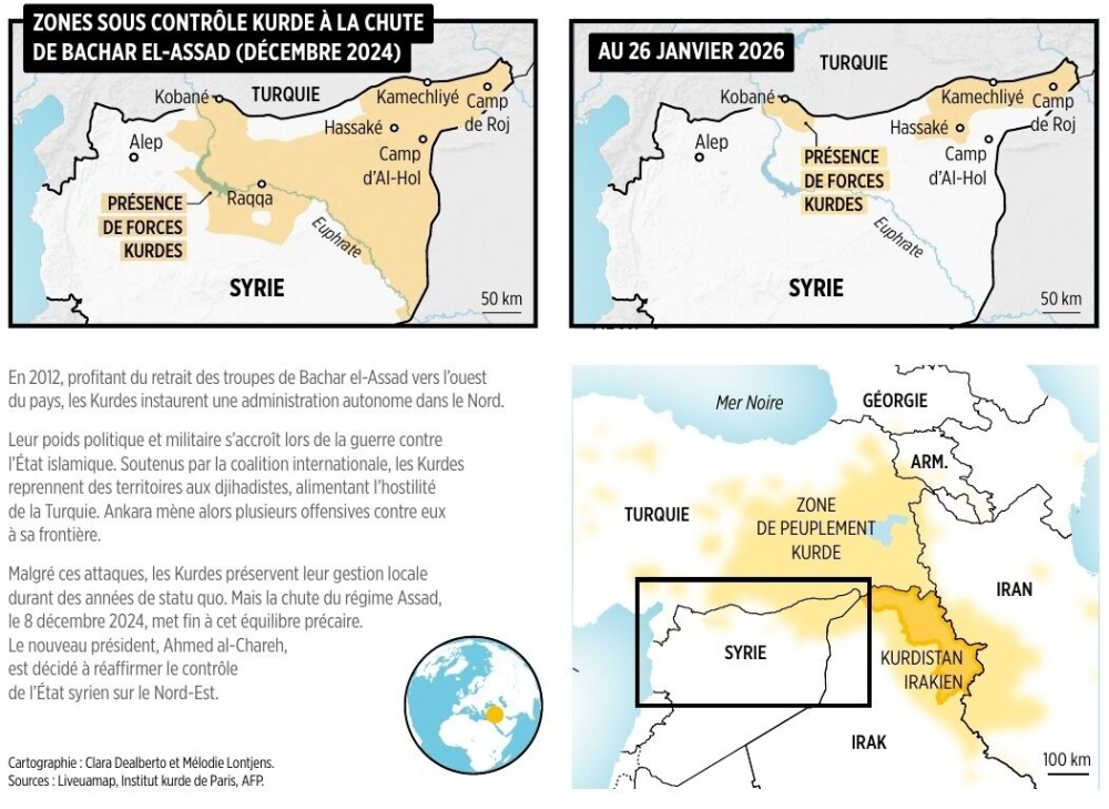 Conditions. En attendant, l’arrêt provisoire des combats offre à ses hommes un répit bienvenu. Dans leur poste avancé, ils en profitent pour siroter du maté, laver leur linge et astiquer leurs armes. D’ici au 8 février, l’administration kurde est censée appliquer les accords signés avec Damas – qui prévoient la dissolution des institutions du Rojava, l’intégration des Forces démocratiques syriennes (FDS) dans l’armée régulière et la nomination de Kurdes à des postes clés, notamment ceux de vice-ministre de la Défense et de gouverneur de la province de Hassaké. « Nous sommes prêts à négocier pour sauver notre peuple, fait valoir Azad Hassaké. Il y a des pas que nous ne pouvons pas franchir. Mais l’intégration de nos forces dans l’armée syrienne ne peut se faire que dans le but de défendre notre terre. Pas pour nous fondre dans leurs troupes. Le plus difficile, c’est l’avenir des unités de femmes, les YPG. Comment vont-elles cohabiter avec ces fanatiques ? »